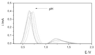 ![]() Figura 3. Voltamogramas de pulso diferencial com solução de cloridrato de anilina 4,0 x 10-3 mol L-1 em tampão BR 0,04 mol L-1 e ajuste de força iônica pela condição A. Variação crescente do pH indicada pela seta