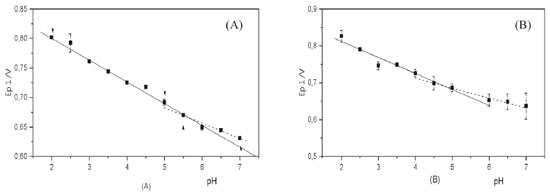 Na Figura 4 são apresentados a variação do potencial de pico anódico Ep1 em função do pH para as condições de força iônica A e B. Para a condição A (Figura 4A), as retas foram obtidas por modelos de regressão linear simples, pois o gráfico do desvio padrão de pico em cada ponto não apresentou correlação com o pH. A qualidade do ajuste, assim como a faixa adequada, foi verificada por gráficos de resíduos.