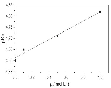 ![]() Figura 5. Influência da força iônica no valor de pKa da anilina de acordo com os valores da literatura criticamente selecionados por Martell e Smith22