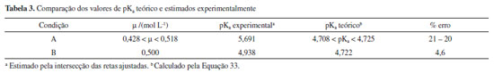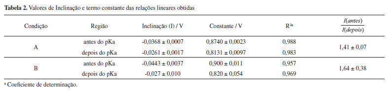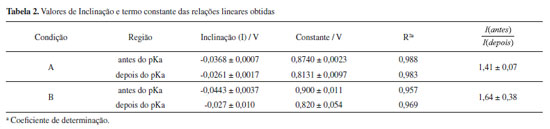 Na Tabela 2 são apresentados os valores de inclinação e termo constante das curvas ajustadas. Os valores de pKa estimados pela intersecção das retas são apresentados na Tabela 3.
