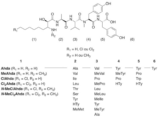 A triagem suspeita detectou possíveis variantes de MG em 7 amostras de linhagens de cianobactérias e em 2 amostras ambientais, sendo alguns íons detectados compatíveis com íons de MG já identificados na literatura (Tabela 3S). Os analisadores de massas do tipo QqQ permitem análises rápidas e sensíveis de compostos em misturas complexas, no entanto, os experimentos realizados nesse tipo de analisador geram dados de baixa resolução e acurácia. Por essa razão, para obtenção de espectros de massas de alta resolução, que pudessem fornecer dados acerca da composição elementar exata dos analitos e, assim, auxiliar na identificação dos compostos suspeitos, as amostras consideradas positivas foram também analisadas por LC-QTOF-MS/MS. A elucidação estrutural por técnicas de espectrometria de massas são baseadas em comparações com perfis de fragmentação de compostos similares já identificados e pelo estabelecimento da fórmula molecular, por meio da precisão de massas (m/z) e do padrão isotópico obtido por técnicas espectrométricas de alta resolução.7,41 A identificação das microgininas foi baseada nos fragmentos diagnósticos de m/z 128 Da (fragmento Ahda), m/z 142 Da (fragmento MeAhda), m/z 162 Da (fragmento Cl-Ahda) e m/z 196 Da (fragmento Cl2-Ahda). Como a maioria das MG descritas apresenta resíduos de tirosina (Tyr), homotirosina (HTy), N-metil tirosina (N-MeTyr) ou prolina (Pro) na porção C-terminal, os fragmentos gerados a partir das perdas neutras correspondentes a esses aminoácidos auxiliaram na identificação da sequência peptídica, assim como a busca por íons imônio, considerados íons diagnóstico, podendo indicar a presença ou ausência de determinados aminoácidos na sequência peptídica. A busca pelos íons detectados no método de PIS permitiu a identificação de 19 variantes de MG. Dessas, 8 apresentaram massa molecular e perfil de fragmentação diferentes daquelas já reportadas na literatura, indicando a possibilidade de ser um novo congênere de MG. Algumas apresentaram perfil de fragmentação semelhante àquelas já descritas, mas com diferença de unidade de massas de 14 Da (-CH2), 34 Da (-Cl) ou 16 Da (-O), referente à metilação, cloração ou desidroxilação na molécula, respectivamente. As MG detectadas que não apresentaram correspondência com nenhuma das listadas na Tabela 3S, através das informações de massa exata e fórmula molecular e perfil de fragmentação, foram consideradas moléculas inéditas e sua estrutura proposta. Na Tabela 3 estão listados os congêneres de MG identificados nas amostras após confirmação por espectrometria de massas de alta resolução e na Tabela 4 a sequência de aminoácidos proposta para as variantes consideradas inéditas. Os espectros MS obtidos por LC-ESI-QqQ-MS/MS no modo PIS e os espectros obtidos via LC-HR-ESI-QTOF-MS/MS das microgininas identificadas nas amostras estão representados nas Figuras 1S - 8S.