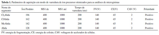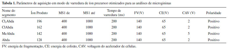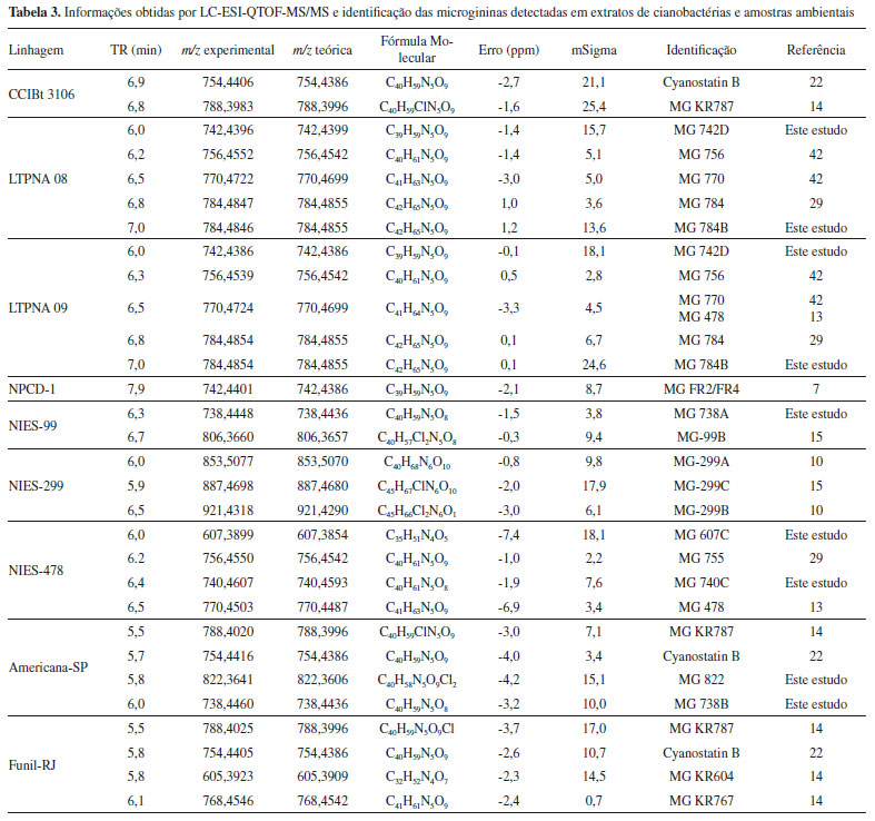 O espectrômetro de massas foi operado no modo varredura de íon precursor para o monitoramento dos íons precursores que originam os íons produtos de m/z 128, 142, 162 e 196, referentes aos fragmentos não-metilado, metilado, clorado e diclorado, respectivamente, resultantes da clivagem da cadeia lateral do resíduo Ahda. Esses fragmentos são considerados íons diagnósticos da classe das microgininas. A separação cromatográfica foi obtida em uma coluna Luna C18 (2) (150 x 2,0 mm, 4 μ - Phenomenex), protegida com uma pré-coluna de mesma fase estacionária, e mantida à 40 °C. Os eluentes utilizados como fase móvel foram: (A) H2O contendo 5 mmol. L-1 de formiato de amônio e 0,1% de ácido fórmico e (B) acetonitrila, a uma vazão de 0,25 mL min-1. O gradiente de eluição foi de 25 a 55% de B (0-10 min), de 55 a 90% de B (10-10,5 min), mantido a 90% de B (10,5 - 13,5 min) para a limpeza da coluna, e de 90 a 25% de B (13,5-20 min) para reequilíbrio da coluna. Antes de cada injeção de amostra (5 µL), a agulha do injetor foi lavada com isopropanol:metanol:água (80:10:10, v/v). As amostras consideradas positivas foram analisadas posteriormente por LC-QTOF-MS/MS para a identificação e caracterização das microgininas suspeitas. Identificação das microgininas por LC-QTOF-MS/MS A detecção, identificação e caracterização estrutural das microgininas suspeitas foram realizadas por cromatografia líquida de alta eficiência acoplada à espectrometria de massas de alta resolução.28 As análises cromatográficas foram realizadas em sistema cromatográfico Shimadzu Prominence (Shimadzu, Kyoto, Japão) com detector de arranjos de diodos (SPD-M20A) acoplado a um espectrômetro de massas com analisador do tipo quadrupolo-tempo-de-vôo (QTOF) (MicroTOF-QII, Bruker Daltonics, MA, EUA), equipado com fonte electrospray (ESI). O equipamento foi operado no modo positivo de ionização, com potencial capilar de 3500 V, pressão do gás nebulizador (nitrogênio) de 35 psi e temperatura e vazão do gás secante (nitrogênio) de 5 mL min-1 a 300 °C. Uma solução de formiato de sódio 10 mmol L-1 em isopropanol:água (1:1, v/v) foi utilizada como calibrante externo. O instrumento foi operado em modo de varredura (full scan) e em modo Auto MS/MS, na faixa de 50 a 2000 m/z, realizando experimentos de MS/MS sobre os 3 íons mais intensos obtidos no modo MS scan. Os parâmetros de separação cromatográfica foram os mesmos utilizados no método de precursor ion scan por LC-QqQ-MS/MS. O processamento dos dados foi realizado no software Data Analyses 4.0 (Bruker Daltonics). A composição elementar, o desvio entre a massa medida e a massa teórica em [ppm] (err) e a comparação do valor do padrão isotópico teórico e medido do pico de interesse, por meio de score (mSigma), foram calculados usando Smart Formula Editor. A confirmação da fórmula molecular foi baseada nos limites amplamente aceitos de 5 ppm e 20 mSigma. Os resíduos de aminoácidos foram determinados através do cálculo da diferença de massa entre uma série de íons fragmentos sucessivos, identificando íons das séries -a, -b e -y. Além da busca por perdas neutras de CO (-28 u) por parte de um íon -b (íon -a) e perdas neutras de moléculas de H2O (-18 u) e NH3 (-17 u) a partir de íons -b e -y, a busca por íons imônio na região de baixas massas do espectro também pôde fornecer informações inerentes à composição dos aminoácidos dos peptídeos.40