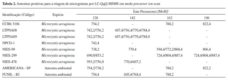 RESULTADOS E DISCUSSÃO Triagem de microgininas pelo método de varredura do íon precursor (Precursor ion scan) O método de precursor ion scan por LC-MS/MS (QqQ) foi testado em linhagens de cianobactérias mantidas em laboratório e amostras ambientais coletadas de lagos e reservatórios brasileiros (Tabela 2S). As amostras positivas para a triagem de microgininas estão compiladas na Tabela 2 e identificadas com os íons precursores que deram origem aos respectivos íons produto selecionados (íons diagnósticos).