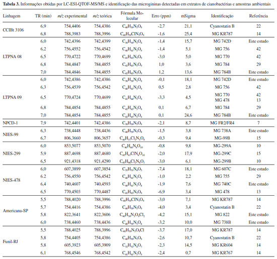 REFERÊNCIAS 1. Paerl, H. W.; Paul, V. J.; Water Res. 2012, 46, 1349; Glibert, P. M.; Mar. Pollut. Bull. 2017, 124, 591; Paerl, H. W.; Huisman, J.; Environ. Microbiol. Rep. 2009, 1, 27. 2. Codd, G. A.; Ecol. Eng. 2000, 16, 51; Huisman, J.; Codd, G. A.; Paerl, H. W.; Ibelings, B. W.; Verspagen, J. M. H.; Visser, P. M.; Nat. Rev. Microbiol. 2018, 16, 471. 3. Elersek, T.; Blaha, L.; Mazur-Marzec, H.; Schmidt, W.; Carmeli, S. Em Handbook of Cyanobacterial Monitoring and Cyanotoxin Analysis; Meriluoto, J.; Spoof, L., Codd, A., eds.; Wiley: New Jersey, 2017, cap. 19. 4. Huang, I. S.; Zimba, P. V.; Harmful Algae 2019, 83, 42. 5. Singh, R. K.; Tiwari, S. P.; Rai, A. K.; Mohapatra, T. M.; J. Antibiot. 2011, 64, 401; Swain, S. S.; Paidesetty, S. K.; Padhy, R. N.; Biomed. Pharmacother. 2017, 90, 760; Demay, J.; Bernard, C.; Reinhardt, A.; Marie, B.; Mar. Drugs 2019, 17, 320. 6. Welker, M.; Von Döhren, H.; FEMS Microbiol. Rev. 2006, 30, 530. 7. Welker, M.; Maršálek, B.; Šejnohová, L.; von Döhren, H.; Peptides 2006, 27, 2090. 8. Okino, T.; Matsuda, H.; Murakami, M.; Yamaguchi, K.; Tetrahedron Lett. 1993, 34, 501. 9. Sano, T.; Kaya, K.; Phytochemistry 1997, 44, 1503. 10. Ishida, K.; Matsuda, H.; Murakami, M.; Yamaguchi, K.; Tetrahedron 1997, 53, 10281. 11. Stewart, A. K.; Ravindra, R.; Van Wagoner, R. M.; Wright, J. L. C.; J. Nat. Prod. 2018, 81, 349. 12. Zervou, S. K.; Gkelis, S.; Kaloudis, T.; Hiskia, A.; Mazur-Marzec, H.; Chemosphere 2020, 248, 125961. 13. Ishida, K.; Kato, T.; Murakami, M.; Watanabe, M.; Watanabe, M. F.; Tetrahedron 2000, 56, 8643. 14. Lodin-Friedman, A.; Carmeli, S.; Mar. Drugs 2018, 16, 78. 15. Ishida, K.; Matsuda, H.; Murakami, M.; Tetrahedron 1998, 54, 13475. 16. Ploutno, A.; Carmeli, S.; Tetrahedron 2002, 58, 9949. 17. Strangman, W. K.; Wright, J. L. C.; Tetrahedron Lett. 2016, 57, 1801. 18. Reshef, V.; Carmeli, S.; Tetrahedron 2001, 57, 2885. 19. Paiva, C. R. F.; Ferreira, M. G.; Trossini, H. G. G.; Pinto, E.; Molecules 2017, 22,1884. 20. Ferreira, G. M.; Kronenberger, T.; de Almeida, É. C.; Sampaio, J.; Terra, C. F.; Pinto, E.; Trossini, G. H. G.; Molecules 2019, 24, 4369. 21. Lifshits, M.; Carmeli, S.; J. Nat. Prod. 2012, 75, 209. 22. Sano, T.; Takagi, H.; Morrison, L. F.; Metcalf, J. S.; Codd, G. A.; Kaya, K.; Phytochemistry 2005, 66, 543. 23. Bober, B.; Bialczyk, J.; J. Appl. Phycol. 2017, 29, 1355. 24. Lenz, K. A.; Miller, T. R.; Ma, H.; Chemosphere 2019, 214, 60. 25. Fernandes, K.; Gomes, A.; Calado, L.; Yasui, G.; Assis, D.; Henry, T.; Fonseca, A.; Pinto, E.; Toxins 2019, 11, 220. 26. Ujvárosi, A. Z.; Hercog, K.; Riba, M.; Gonda, S.; Filipič, M.; Vasas, G.; Žegura, B.; Chemosphere 2020, 240, 124880. 27. Welker, M.; Brunke, M.; Preussel, K.; Lippert, I.; von Döhren, H.; Microbiology 2004, 150, 1785. 28. Sanz, M.; Andreote, P. A.; Fiore, F. M.; Dörr, A. F.; Pinto, E.; Mar. Drugs 2015, 13, 3892. 29. Riba, M.; Kiss-Szikszai, A.; Gonda, S.; Boros, G.; Vitál, Z.; Borsodi, A. K.; Krett, G.; Borics, G.; Ujvárosi, A. Z.; Vasas, G.; Toxins 2019, 11, 288. 30. Mekebri, A.; Blondina, G. J.; Crane, D. B.; J. Chromatogr. A 2009, 1216, 3147; Dörr, F.; Oliveira-Silva, D.; Lopes, N.; Iglesias, J.; Volmer, D.; Pinto, E.; Rapid Commun Mass Spectrom. 2011, 25, 1981; Miles, C. O.; Sandvik, M.; Nonga, H. E.; Rundberget, T.; Wilkins, A. L.; Rise, F.; Ballot, A.; Toxicon 2013, 70, 21; Zastepa, A.; Pick, F. R.; Blais, J. M.; Saleem, A.; Anal. Chim. Acta 2015, 872, 26; McMullin, D. R.; Hoogstra, S.; McDonald, K. P.; Sumarah, M. W.; Renaud, J. B.; J. Visualized Exp. (2019), doi: 10.3791/59712. 31. Beversdorf, L. J.; Rude, K.; Weirich, C. A.; Bartlett, S. L.; Seaman, M.; Kozik, C.; Biese, P.; Gosz, T.; Suha, M.; Stempa, C.; Shaw, C.; Hedman, C.; Piatt, J. J.; Miller, T. R.; Water Res. 2018, 140, 280. 32. Bartlett, S. L.; Brunner, S. L.; Klump, J. V.; Houghton, E. M.; Miller, T. R.; J. Great Lakes Res. 2018, 44, 924. 33. Domon, B.; Aebersold, R.; Science 2006, 312, 212. 34. Sismotto, M.; Paschoal, J. A. R.; Reyes, F. G. R.; Quim. Nova 2013, 36, 449; Vidova, V.; Spacil, Z.; Anal. Chim. Acta 2017, 964, 7. 35. Sagratini, G.; Fernández-Franzón, M.; De Berardinis, F.; Font, G.; Vittori, S.; Mañes, J.; Food Chem. 2012, 132, 537; Palagama, D. S. W.; Baliu-Rodriguez, D.; Lad, A.; Levison, B. S.; Kennedy, D. J.; Haller, S. T.; Westrick, J.; Hensley, K.; Isailovic, D.; J. Chromatogr. A 2018, 1573, 66. 36. Stolker, A. A. M.; Niesing, W.; Hogendoorn, E. A.; Versteegh, J. F. M.; Fuchs, R.; Brinkman, U. A. T.; Anal. Bioanal. Chem. 2004, 378, 955; Asimakopoulos, A. G.; Kannan, P.; Higgins, S.; Kannan, K.; Anal. Bioanal. Chem. 2017, 409, 6205. 37. https://portalarquivos2.saude.gov.br/images/pdf/2018/marco/29/PRC-5-Portaria-de-Consolida----o-n---5--de-28-de-setembro-de-2017.pdf, acessada em agosto de 2020. 38. Gorham, P. R.; McLachlan, J.; Hammer, U. T.; Kim, W. K.; SIL Proceedings, 1922-2010. Internationale Vereinigung für Theoretische und Angewandte Limnologie: Verhandlungen 1964, 15, 796. 39. Sanz, M.; Salinas, R. K.; Pinto, E.; J. Nat. Prod. 2017, 80, 2492. 40. Paizs, B.; Suhai, S.; Mass Spectrom. Rev. 2005, 24, 508; Cantú, M. D.; Carrilho, E.; Wulff, N. A.; Palma, M. S.; Quim. Nova 2008, 31, 669. 41. Pilon, A. C.; Selegato, D. M.; Fernandes, R. P.; Bueno, P. C. P.; Pinho, D. R.; Carnevale Neto, F.; Freire, R. T.; Castro-Gamboa, I.; Bolzani, V. S.; Lopes, N. P.; Quim. Nova 2020, 43, 329. 42. Carneiro, R. L.; Dörr, F. A.; Dörr, F.; Bortoli, S.; Delherbe, N.; Vásquez, M.; Pinto, E.; FEMS Microbiol. Ecol. 2012, 82, 692. 43. Le Manach, S.; Duval, C.; Marie, A.; Djediat, C.; Catherine, A.; Edery, M.; Bernard, C.; Marie, B.; Frontiers in Microbiology 2019, 10, 791. 44. Janssen, E. M. L.; Water Res. 2019, 151, 488. 45. Benayache, N.; Nguyen-Quang, T.; Hushchyna, K.; McLellan, K.; Afri-Mehennaoui, F.-Z.; Bouaïcha, N. Em Limnology: Some New Aspects of Inland Water Ecology; Gokce, D., ed.; IntechOpen: London, 2019, cap. 2. 46. Gesner-Apter, S.; Carmeli, S.; Tetrahedron 2008, 64, 6628. 47. Xiao, Y