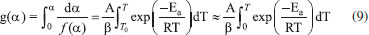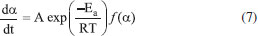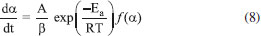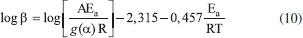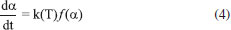 PARTE EXPERIMENTAL Caracterização térmica do material A análise termogravimétrica vem sendo amplamente utilizada como um método para investigar a decomposição térmica de polímeros e outros materiais, por exemplo, para determinar sua estabilidade térmica. Além disso, uma grande atenção vem sendo dada para a extrapolação dos dados termogravimétricos para determinação de parâmetros cinéticos.14 A termogravimetria (TGA) é uma das técnicas de análise térmica que envolve o estudo da variação de massa em função da temperatura e/ou tempo. Com auxílio dessa técnica é possível realizar estudos da cinética de degradação de um material. Para o estudo do perfil térmico da amostra e determinação dos parâmetros cinéticos da decomposição térmica do revestimento, foram utilizadas as técnicas analíticas de termogravimetria (TGA) e de calorimetria exploratória diferencial (DSC). Os ensaios de TGA foram orientados pela norma ASTM E 1131-08.15 Em relação às condições, empregou-se razão de aquecimento de 10 °C min-1, massa de amostra de 4 mg, atmosfera de ar sintético, com vazão de 50 mL min-1. Os equipamentos utilizados foram o DSC modelo Q20, Marca TA Instruments com acessório de resfriamento tipo RCS 40, com porta-amostra de alumínio hermético, e o TGA modelo Q500, Marca TA Instruments, com porta-amostra aberto de platina. Métodos de determinação dos parâmetros cinéticos O estudo da cinética de degradação de um determinado sistema analítico permite encontrar modelos cinéticos que melhor descrevam a reação de degradação e gerar variáveis que auxiliem no estabelecimento do tempo de vida do material em estudo.16 A degradação de materiais poliméricos decorre de reações químicas ou físicas sofridas pelo material e que podem ser relacionadas ao tipo de aplicação e ao meio ambiente ao qual foi submetido. Esse processo afeta a estrutura do material, alterando suas propriedades. Logo, o conhecimento do estudo cinético a partir da degradação térmica também consiste em um importante fator a ser determinado para diversas aplicações.17,18 Método isoconversional A cinética não isotérmica pode ser classificada como modelo livre, também chamado de método isoconversional e é mais comumente empregada para realizar a análise cinética de reações no estado sólido. Muitos métodos cinéticos foram propostos para ajustar os dados alcançados com a finalidade de obter os parâmetros que caracterizam o processo de degradação térmica de amostras de espécies químicas. Considera-se a taxa de reação constante na faixa de conversão (α) e dependente somente da temperatura (T).19 A cinética das reações químicas em sólidos, mais especificamente a degradação térmica, tal como para a reação genérica, s1S1(s) → s2S2(s) + gG(g), pode ser descrita pela taxa de conversão do reagente S1 nos outros, geralmente determinado como uma derivação da lei de ação de massas, originalmente proposto por Guldberg e Waage:20 ![]() em que α é o grau de conversão, t é o tempo, dα/dt é a taxa de reação, k(T) é o coeficiente de taxa a uma temperatura absoluta T e f(α) é uma função de α, com sua forma exata dependendo da ordem do modelo cinético. A conversão α da amostra pode ser calculada a partir da perda de massa da amostra durante a reação química (degradação térmica):20 ![]() em que m representa a massa da amostra restante no tempo t; mf, a massa final da amostra quando a reação está completa e, m0, a massa inicial da amostra. A constante de velocidade da reação k(T) pode ser expressa em função da temperatura absoluta T empregando várias equações. No entanto, a expressão mais usada para k(T) é descrita na Equação 6:20 ![]() em que A, Ea e R representam o fator pré-exponencial, a energia de ativação e a constante universal dos gases, respectivamente. Considerando a relação de Arrhenius para o coeficiente de taxa e temperatura absoluta, a constante de velocidade, Equação 7 pode ser escrita de forma diferencial como: ![]() Para condições não isotérmicas, quando a temperatura absoluta aumenta com o tempo a uma razão de aquecimento constante, β = dT / dt, a Equação 4 pode ser representada como: ![]() Assumindo que o fator pré-exponencial seja independente da temperatura, pode-se obter a forma integral da equação de grau de conversão: ![]() Em que o limite inferior de integração da última integral pode ser aproximado para zero, desde que o grau de conversão seja desprezível para temperaturas abaixo da temperatura ambiente T0. Método de Flynn-Wall-Ozawa A energia de ativação pode ser calculada pelo método isoconversional de Flynn-Wall-Ozawa (FWO) para o estudo da cinética de degradação com o uso de dados de curvas TGA. A vantagem desse método é a determinação da energia de ativação sem que seja necessário conhecer a ordem da reação. Ele assume que a função de grau de conversão f(α) permanece constante para todos os valores de conversão α em diferentes razões de aquecimento β. A partir do gráfico de ln(β) versus 1000/T obtém-se a energia de ativação Ea.21,22 Para FWO, emprega-se a Equação 9 e a aproximação de Doyle,14 e o resultado da integração depois de aplicar logaritmos é: ![]() O erro aproximado da energia de ativação pode ultrapassar até 10%, dependendo do valor de Ea / RT.14