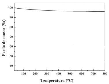 ![]() Figura 1. Curva termogravimética de amostra de carbeto de silício nanoparticulado. A razão de aquecimento empregada foi de 10°C m-1, a atmosfera empregada foi oxigênio. A vazão de gás e a quantidade de amostra analisada não foram informadas. Adaptado da ref. 10