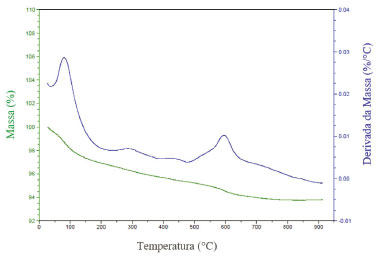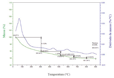 ![]() Figura 5. Curva TG/DTG de amostra do revestimento com massa inicial de amostra 4,1 mg, na razão de aquecimento de 10 °C min-1, em atmosfera inerte de N2 com vazão de 50 mL min-1