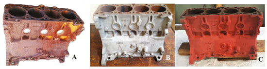 ![]() Figura 3. Superfície do bloco do motor de combustão interna oxidada (A), superfície do mesmo bloco do motor preparada para receber o revestimento por jateamento com granalha de aço - grau metal quase ao branco (B) e superfície após aplicação do revestimento protetivo (C)