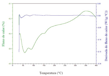![]() Figura 4. Curva DSC de amostra do revestimento com massa inicial de amostra de 4,1 mg, na razão de aquecimento de 10 °C min-1, em atmosfera inerte de N2 com vazão de 50 mL min-1