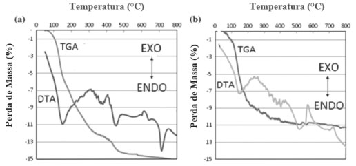 ![]() Figura 6. Curvas DTA - TGA comparativas do silicato de sódio usado como ligante (a) e do silicato de potássio usado como ligante (b)