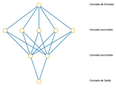 ![]() Figura 1. Representação da estrutura de uma rede neural. Os círculos laranjas representam as unidades e as linhas azuis representam a distribuição dos resultados matemáticos gerados pelos neurônios e enviados à próxima camada