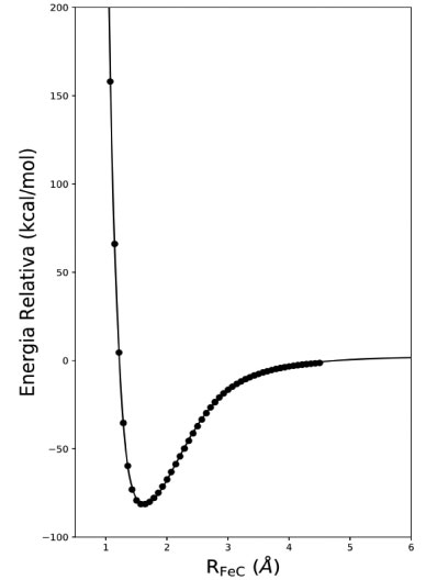 ![]() Figura 2. Curva de energia potencial para a diatômica FeC, ajustada utilizando redes neurais. A curva sólida é referente à energia prevista pela rede neural, enquanto os pontos são aqueles calculados pelo método de estrutura eletrônica no nível teórico B3LYP/def2-TZVP