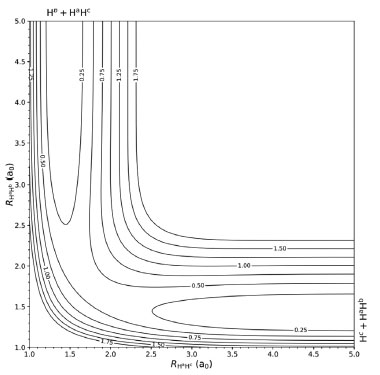 ![]() Figura 3. SEP da reação Hc + HªHb → Hb + HªHc colinear, ajustada pela rede neural, em coordenadas internas (RHª Hc, RHª Hb). As curvas isopotenciais são de 0,25 eV. As distâncias, nos dois eixos, estão em a0