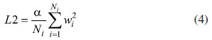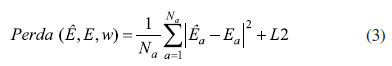Os parâmetros de cada unidade dessa rede serão variados de forma a minimizar a função de perda, equação 3, que é dependente do erro quadrático médio entre os dados de saída calculados, Ê, e os fornecidos como alvo, E, que são vetores com o número de pontos igual ao utilizado para o treino da rede, Nα, e um fator de regularização, o L2, definido na equação 4. Os termos que compõem a equação 4 são o parâmetro a, o número de neurônios, Ni, e os pesos de cada neurônio i, wi. O fator L2 permite uma regularização maior ao direcionar os pesos o mais perto possível de zero, podendo-se controlar a influência da regularização na determinação dos parâmetros e no desempenho do modelo, pelo valor do a. Na prática, esse parâmetro pode reduzir a importância de cada valor individual dos dados de entrada, privilegiando a suavidade do modelo final, podendo levar a underfitting, se muito grande, e overfitting, se muito pequeno. Overfitting acontece se o modelo previsto se ajusta aos dados fornecidos, porém, ao fazer previsões para pontos, fora do conjunto de treinamento, tem erros grandes.33 Underfitting é o efeito contrário.