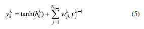 A função de ativação utilizada nas unidades das camadas escondidas será a tangente hiperbólica. Essa função tem os seus limites de ±∞ iguais a ±1 As unidades das camadas escondidas são definidas da seguinte forma: