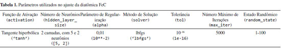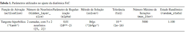 Em que Nl1 é o número de neurônios na camada l - 1 e j é um neurônio da camada l - 1. O parâmetro é o peso da conexão do neurônio k da camada l com o neurônio j da camada l -1 e é o viés do neurônio k da camada l, sendo ambos determinados durante o processo de treinamento da rede neural por uma regressão não linear. Vale notar que, para a camada de saída, é utilizada a função identidade no lugar da tangente hiperbólica, para fornecer um valor escalar que não esteja entre -1 e 1 e, para a camada de entrada, são utilizados os dados como fornecido pelo usuário. Existem vários parâmetros a serem definidos em uma rede neural que podem levar a resultados melhores ou piores, mas apenas alguns serão destacados. Para uma explicação mais ampla, referências específicas são recomendadas ao leitor.34-37 Um dos parâmetros a ser definido é o tamanho da rede neural. Uma técnica para determinar a quantidade de camadas e o número de neurônios nas camadas é começar com uma camada escondida do tamanho da camada de entrada e, a partir disso, construir redes neurais maiores,31 considerando que, ao aumentar, o custo computacional também cresce, assim como a possibilidade de overfitting. O processo de minimização da função de perda parte de um valor inicial para, a partir desse valor, seguir na direção do gradiente da função de perda, equação 3. A construção da rede precisa ser feita com valores iniciais para os pesos e vieses. A escolha desses parâmetros iniciais, a priori, não tem um valor preferido. Então, a escolha deles é gerada de forma randômica. O grande problema é que a otimização desses parâmetros acontece de forma não linear, não tendo apenas um mínimo. Portanto, ela pode parar em mínimos locais, o que faz a escolha desses parâmetros iniciais influenciar no resultado final. Então, para escolher os parâmetros iniciais, é feita uma amostragem pela variação do estado randômico e, após a otimização das redes neurais, seleciona-se o que produzir o menor erro, por exemplo. Na Tabela 1, estão reunidos alguns passos que foram aqui citados, para auxiliar o leitor em aplicações mais simples e fornecer uma ideia geral do procedimento.