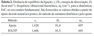 DISCUSSÃO FeC Determinaremos a curva de energia potencial eletrônica para o FeC utilizando redes neurais feed-forward com treino supervisionado e, como função de ativação, a tangente hiperbólica, conforme implementado no pacote scikit-learn. O erro quadrático médio será usado para analisar o erro do ajuste. Com essas funções, calcularemos as constantes espectroscópicas, a distância internuclear de equilíbrio, a energia de dissociação e a frequência vibracional harmônica. Isso será feito para validar o ajuste nas regiões entre pontos. Para obter a distância internuclear de equilíbrio, teremos que encontrar a distância que tem como imagem o mínimo de energia potencial eletrônica para a molécula FeC. A energia de dissociação é calculada por meio da diferença entre a energia dos átomos dissociados e da energia na distância internuclear de equilíbrio. A frequência de vibração harmônica pode ser calculada a partir da equação 6. A constante de vibração harmônica, k, é obtida da segunda derivada do potencial na distância de equilíbrio.38 Os outros termos que compõem a equação são μ, que é a massa reduzida, e c, que é a velocidade da luz.
