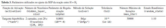 No caso, X são os valores passados às camadas de entrada e de saída e -X é a média dos N valores. Para ajustar a rede neural, existe uma série de parâmetros que precisam ser escolhidos. Definimos que vamos utilizar a tangente hiperbólica nas camadas escondidas, que terão duas camadas com cinco e dois neurônios. Para minimizar a função perda, o método BFGS de baixa memória (lbfgs),48-50 a tolerância e o número máximo de iterações são também escolhidos previamente para valores que produzem bons resultados. Um parâmetro importante é o estado randômico de inicialização dos parâmetros, já que esse é um ajuste não linear com diversos mínimos locais. É feita uma estrutura de repetição, procurando-se o conjunto de valores iniciais que produz menor erro quadrático médio, dentro de 100 tentativas. Por ser um conjunto de dados pequenos e uma rede simples, essas 100 tentativas levam algo em torno de 20 segundos para terminar. Por fim, também escolhemos o parâmetro a, da regularização L2, como 10-2. Ao final desse passo, a função final é obtida, pronta para o uso. Os parâmetros utilizados no ajuste estão reunidos na Tabela 1. Esses valores não são os únicos a produzir um ajuste adequado. Pode-se fazer um teste variando o número de neurônios na rede. Uma sugestão seria experimentar com três neurônios na primeira camada e dois na segunda. Ao utilizar essa função para construir a curva de energia potencial, por meio do pacote matplotlib,51 juntamente aos pontos de estrutura eletrônica, a Figura 2 é produzida.