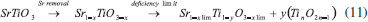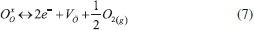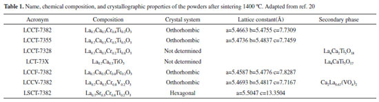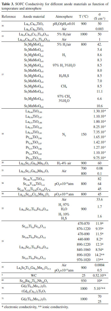 Vashook et al.15 synthesized a series of perovskite-type compounds La1-aCaaCr0.2Ti0.8O3-δ by the solid-state reaction technique (calcination temperature of 1350 °C). The increase in the concentration of Ca decreases the thermal stability of the oxides related to the dissociation of oxygen. The maximum conductivity observed was 50 S cm-1 for a composition of a = 0.95 of dopant. This Ca composition corresponds to a Cr3+/Cr4+ = 1 ratio, oxygen stoichiometry (3-δ) = 3 and the oxidation states of La, Ca and Ti ions of 3+, 2+ and 4+, respectively. In reducing atmosphere, the maximum conductivity is observed with a concentration of a = 0.6 of dopant, corresponding to the ratio of Ti3+/Ti4+ = 1, oxygen stoichiometry (3-δ) = 2.92 and the oxidation states of La, Ca and Ti of 3+, 2+ and 3+, respectively. The change in conductivity of La1-aCaaCr0.2Ti0.8O3-δ from n-type to p-type occurs with an increase in Ca content from a = 0.7 to a = 0.9. In addition, a change in the type of conductivity with a = 0.8 was observed in extremely reducing atmospheres pO2 < 10-10, where the conductivity is n-type (slope of the log(Σ) versus log(pO2) is negative), while in oxidizing atmospheres La0.2Ca0.8Cr0.2Ti0.8O3-δ becomes a p-type semiconductor. In Vashook et al.16 work, two series of perovskite La(1-x)CaxTiO3 (x = 0.2 - 1) and La2(1-x)/3CaxTiO3 (x = 0.2 - 1) compounds were synthesized by the solid-state reaction technique (calcination temperature of 1350 °C). Perovskite La0.4Ca0.4TiO3 revealed a tetragonal structure between 470 K and 1070 K, and cubic at 1170 K. The structure of the perovskite La2(1-x)/3CaxTiO3 is stabilized with small amounts of Ca. Point defects are considered for La(1-x)CaxTiO3-δ and La2(1- x)/3CaxTiO3. The n-type conduction can be explained by the creation of defects, associated with the reduction of Ti4+ to Ti3+ by the removal of oxygen (Equation 6): ![]() Huang et al. (2006a)17 showed that each oxygen vacancy reduces 2 moles of Mo6+ to Mo5+, providing good electronic conductivity to Sr2MnMoO6-δ and Sr2MgMoO6-δ anodes. In the same work, it was found that the electronic conductivity decreases with the increase in the partial pressure of O2, but the conductivity of the Sr2MnMoO6-δ was more sensitive to pressure variation. In Lepe et al.18 work, oxides with the general formula Ln2/3-xTiO3-3x/2 (Ln = La, Pr and Nd; 0.07 ≤ x <0.13) were prepared by a new synthesis route, adding Ln2/3-xLi3xTiO3 precursors, prepared by two methods: solid-state reaction and sol-gel (modification of the Pechini process),19 followed by dehydration and calcination steps. Results from EIS showed that the resistance in the grain boundaries three times greater than that of the bulk for the lanthanum and praseodymium titanates. Comparing the two titanates, it was concluded that the resistance in the grain boundary region with La is smaller than that with Pr. This result can be attributed to small structural differences since the diffractogram of the compound with Pr shows peaks attributed to the tetragonal phase. The type of imperfections depends on the way the crystal was formed. Defects modify the electrical behavior of the material. Results presented proved that the conductivity in the bulk of the compound with La is greater than that with Pr. Pudmich et al.20 investigated materials with perovskite-type structures based on lanthanum chromates and strontium titanates as possible materials for SOFC anodes. Table 1 shows the studied materials. It was found that the higher the concentration of Ti, the greater the electronic conductivity of the material while the increase in the concentration of Cr reduces the electronic conductivity of the same compound. In samples rich in Cr, the electronic conductivity in air was higher than in the presence of H2. Thus, as a p-type conductor (excess of electron holes), conductivity is decreased in reducing atmospheres due to the reduction in electron holes in combination with increased O2 vacancy concentration. In the case of Ti-rich samples, conduction is n-type (excess of electrons) and charge carriers (electrons) are formed during the reaction. EIS measurements and analysis showed a certain activity of the La0.7Sr0.3Cr0.8Ti0.2O3 electrode on hydrogen oxidation, but the performance remained low when compared to the Ni-YSZ composite.