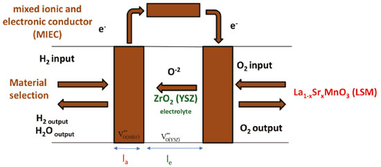 However, there are many limitations to the use of Ni-YSZ as an anodic material, mainly including a Ni agglomeration in a long-term operation and the formation of carbon deposits with the breaking of the C-C bond with the use of hydrocarbons. Ni is an excellent catalyst; therefore, carbon is deposited on the Ni surface, diffusing the Ni particle structure, and leading to the formation of carbon filaments,3 bringing the impossibility to operate using hydrocarbon fuels. In this sense, in mixed ionic and electronic conductors (MIEC), charge carriers are combined in one single phase. In this type of material, ionic conductivity can be one order of magnitude higher than in conventional materials as YSZ, which allows decreasing the operation temperature, improving the SOFC performance and durability, as well as, making it possible to reduce the manufacturing costs of this fuel cell. Moreover, these materials can extend the active electrochemical regions for whole electrode surface. MIEC performs both as catalyst and as electrons and ions carrier. The electrochemical reactions are not restricted to the conductor interface but can occur along the entire surface.4 Comparing Figure 1 with Figure 2, it can be noted that the oxygen vacancy region, using MIEC as an anode, is not only restricted to the anode/electrolyte interfacial region , but it is also present along the anode thickness of (la) .