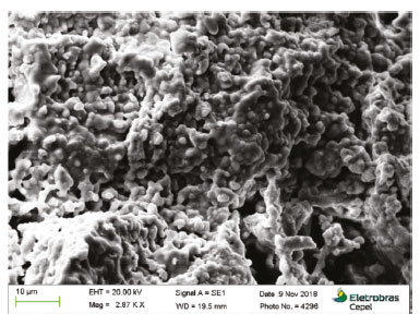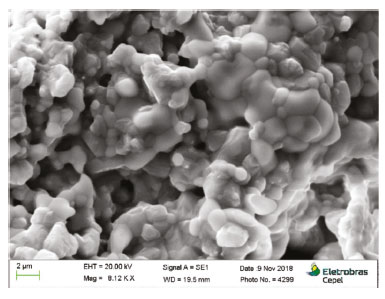 Figures 3 and 4 present micrographs of a potential material composed by 8% Y-doped SrTiO3. It is possible to notice a well-defined grain boundary with an efficient interface formation between YSZ and YST08 grains, showing that both are compatible with no physical segregation. Another important characteristic shown in the structure is the possibility of assembling samples with porosity among 20 - 40 %. In 8% Y-doped SrTiO3, porosity of 36.7 ± 7.2 % was found using 10% w/w of graphite before the sintering process. It is possible to observe that there is wide pore network, this feature is important to maintain the fuel gas diffusivity and the product exhaustion.