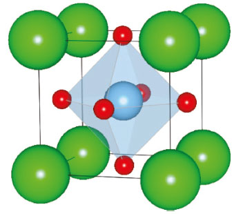 ![]() Figure 5. Crystalline structure of strontium titanate (SrTiO3), Sr atoms are represented by green spheres, O atoms in red and Ti in blue. Adapted from ref. 14
