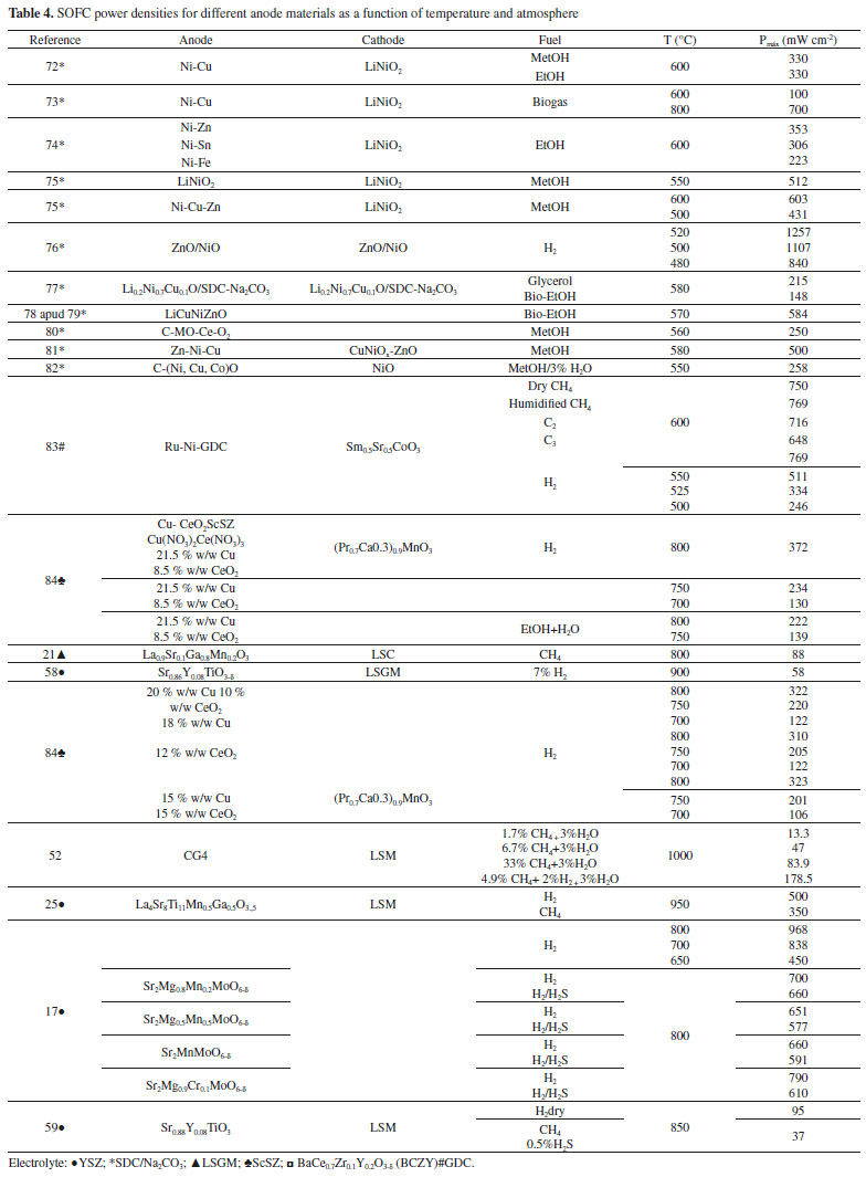 CONCLUSIONS In this work, the authors had the approach of reviewing a large number of published works about materials applied to SOFC anodes. First, we concluded that the currently used material composed by a cermet of Ni/YSZ is not applicable to the new requirements such as the feed with other types of fuels and temperature operation. Subsequently, different types of promissory candidates were discussed, concluding that perovskite compounds are structures with great potential for this kind of application once they are stable under a reducing atmosphere and can be easily synthesized. The major advantage of perovskite anodes is the possibility of changing the physical-chemical characteristics (such as electronic/ionic conductivity and thermal expansion) through doping processes. Many different types of cations can be used as dopants in the A and B sites of the compounds, generating different semiconductors with distinct redox properties and electrocatalytic activity. Among those candidates, the material with mixed, ionic and electronic conductivity consisted by yttrium doped-SrTiO3 stands out as a promising candidate as it can be operated with hydrocarbons fuels (once it does not catalyze the breakage of carbon bonds) at lower temperatures when compared to the operation with Ni/YSZ anodes. These structures showed a satisfactory performance regarding its conductivity, mainly when doped with 8% of the Y cation. However, at this concentration, the solubility limit of the dopant is reached and a secondary phase of pyrochlore is formed, this phase presents an electric insulating character. Hence, it was concluded that the presence of a reducing agent in the calcination atmosphere decreases this insulating phase concentration, improving conductivity. Although the research about adequate materials for SOFC anode is advanced and satisfactory, there are still many challenges in the future such as a significant reduction in the operation temperature (~300 - 600 °C), a deeper understanding on the reaction mechanisms of generation and degradation, and constant optimization of electrodes morphology to improve efficiency.