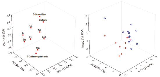 ![]() Figure 1. PC1 versus PC2 versus PC3 loadings and scores plots of coffee samples (+: traditional Brazilian coffees; ο: extra strong Brazilian coffees)