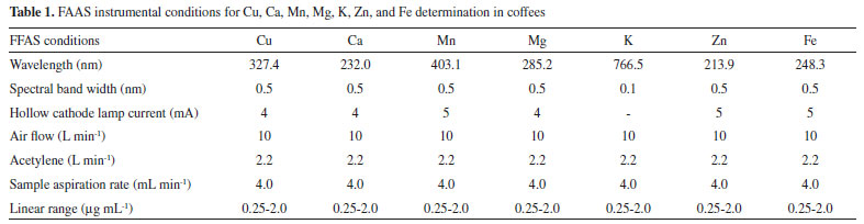 EXPERIMENTAL Reagents, standards, equipment and materials Reagents, solvents and analytical grade materials used: ultrapure water obtained with an ultra-purifier system (18.2 MΩ cm resistivity, Master System®, Gehaka, São Paulo, Brazil); concentrated nitric acid (HNO3) ( 65% w/v, Sigma Aldrich, St. Louis, USA) - previously purified in a quartz sub-boiling system (model DuoPur®, Milestone, Sorisole, Italy); concentrated hydrogen peroxide (H2O2) (30% v/v, Sigma Aldrich, St. Louis, USA); HPLC grade acetonitrile (J.T. Baker, Phillipsburg, USA); acetic acid (purity ≥ 99.8%, Sigma Aldrich, St. Louis, USA); for flame atomic absorption spectrometer (FAAS), the aqueous reference solutions containing Ca, Cu, Fe, K, Mg, Mn, and Zn prepared from each elemental standard (1000 µg mL-1, SCP Science, Baie-d'Urfé, Canada) by serial dilutions. The analysis accuracy procedure was verified using a standard reference material (Embrapa RM-Agro E1001 (FO-01/12), Brachiaria brizantha cv Marandu) digested under similar conditions applied for coffee samples. For HPLC analysis, the following chromatographic standards were used: caffeine and 5-caffeoylquinic acid (5-CQA) (Sigma Aldrich, St. Louis, USA) and an Acclaim® TM Polar advantage II C18 column (3 µm, 120 A, 4.6 x 150 mm) (Thermo Fisher Scientific, Germering, Germany). Coffee samples 21 RG coffee commercial samples were purchased from a local supermarket in the municipality of Medianeira, Paraná, Brazil. All samples weighted 500 g and were vacuum-packed. 9 of them were labelled as traditional (T) and 12 as extra strong (ES). The RG coffees color-characterization was done by lightness (L*)27 measurements in triplicate using a colorimeter (CR-400, Konica Minolta, Tokyo, Japan). The analysis was carried out under an integrating sphere and a 45° viewing angle (lighting d/45 and illuminating D). Microwave digestion and mineral determinations Microwave digestion was performed according to Amorim Filho et al. in triplicate.19 Each sample was weighed (0.400 g) in 50 mL PTFE-TFM closed vessels (standing 310 °C and 40 bar), added with 3 mL HNO3 (65% w/v) and 2 mL H2O2 (30% v/v) and left open at room temperature for 20 min. The samples were subjected to wet digestion using a microwave oven (Multiwave GO®, Anton Paar, Graz, Austria). The USEPA 3052 digestion method was used by linearly increasing the temperature to 180 °C for 4.5 min, kept for 9.5 min and then cooled. Mineral determination was carried out using a flame atomic absorption spectrometer (FAAS) equipped with a Deuterium background correction system (model AA 240-FS, Varian, Australia). K was determined by emission mode, whereas all other analytes were determined by absorption mode. The Schinkel modifier (0.5% v/v) was added to all digested samples and reference solutions. External calibration with a 7-point analytical curve for each analyte was performed at the concentration range described in Table 1. The other FAAS operational conditions for each analyte are shown in Table 1.