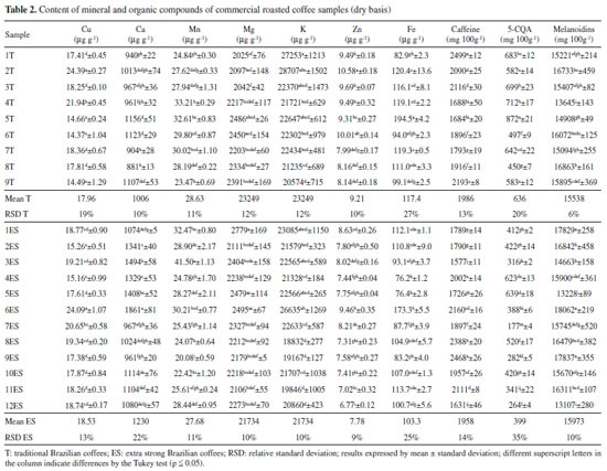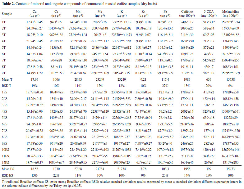 RESULTS AND DISCUSSION The lowest average L* value for ES coffees (19.70 ± 1.25) suggests that they were subjected to a more intense roasting process compared to T coffees (20.75 ± 1.42). However, Souza et al. (2010) observed no difference on the average L* value for T (19.5) and ES (20.5) Brazilian RG coffees, respectively. Such results reinforced that the ES coffee does not necessarily present a darker color. When analyzing samples from different Brazilian brands, origins, and processing techniques, it was observed that the extra strong coffees had a slightly lower L* value than the traditional ones. Coffee samples mineral contents The commercial RG coffee presented a mineral content ranging from 18832 to 28707 µg g-1 for K; 2025 to 2779 µg g-1 for Mg; 881 to 1861 µg g-1 for Ca; 76.2 to 194.5 µg g-1 for Fe; 20.08 to 41.50 µg g-1 for Mn; 14.37 to 24.39 µg g-1 for Cu, and 4.68 to 10.58 µg g-1 for Zn (Table 2).