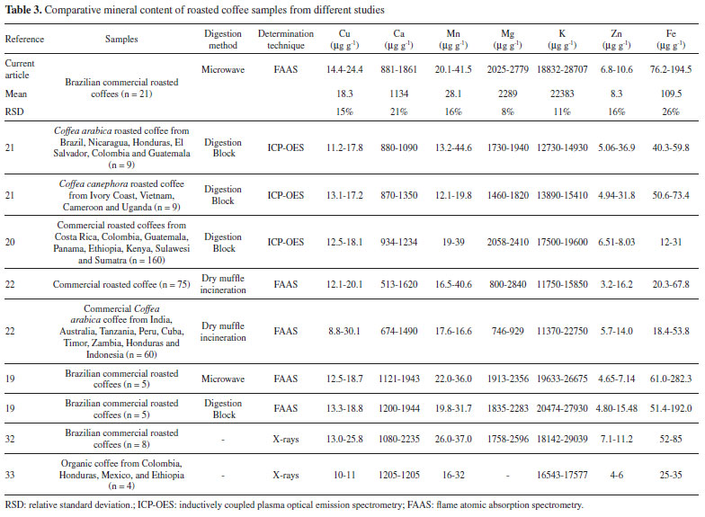 The mineral content was in the range found in the literature for RG coffees (commercial Coffea arabica, Coffea canephora, blends of both species or non-identified coffee of different origins and roasting degrees). Unlike various organic compounds, the minerals found in coffee are not affected by the roasting process;30 and they are nearly entirely found in the final beverage due to their water solubility.31 Different researches have described macronutrient contents ranging from 11370 to 29039 µg g-1 for K, 476 to 2840 µg g-1 for Mg, and 513 to 2235 µg g-1 for Ca (Table 3). The Fe micronutrient content ranged from 12 to 282.3 µg g-1, from 12.1 to 44.66 µg g-1 for Mn, from 8.8 to 30.1 µg g-1 for Cu, and from 3.2 to 36.9 µg g-1 for Zn.19-22,32-33 Further mineral content details found in other studies are seen in Table 3.