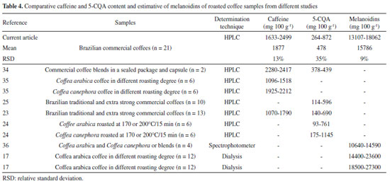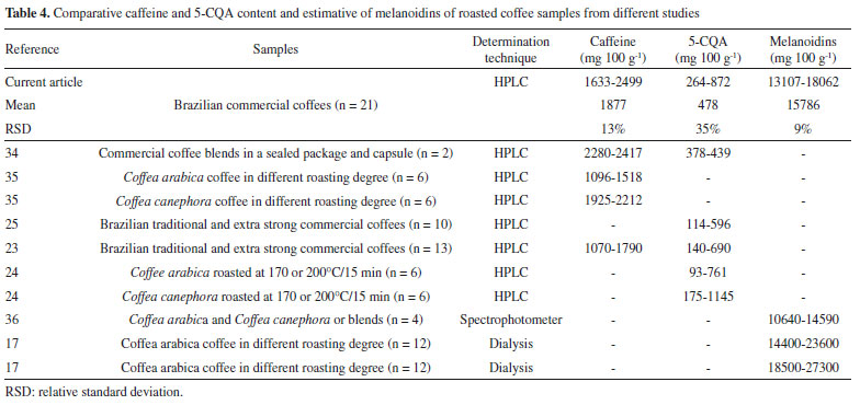 Organic compounds extraction and caffeine, 5-CQA, and melanoidins determination Simultaneous caffeine and 5-CQA analyses and melanoidins estimates were performed as per Kalschne et al..28 Aqueous extracts were obtained in triplicate for the organic compounds determination. Each coffee sample (0.5000 g) was extracted with 30 mL ultrapure water at 80 °C for 10 min and filtered using qualitative paper. For HPLC analysis, a 1 mL extract aliquot was diluted in 5.0 mL acetic acid: water (5:95 v/v). The extract was filtered (0.45 µm) and injected (20 μL) into the chromatograph (Ultimate 3000, Thermo Scientific, Germering, Germany). The mobile phase comprised of acetic acid/ultrapure water (5:95 v/v) (A) and acetonitrile (B), and the following gradient elution was used: 1 min, 5% B; 5 min, 13% B with 0.6 mL min-1. Caffeine and 5-CQA detection were set at 272 and 320 nm, respectively, and identification was based on retention times and UV spectra. Quantification was performed in triplicate (R2 ≥ 0.999 and P < 0.001) by external standardization using 6-point analytical curves (20 to 60 μg mL-1 for caffeine and 0.5 to 30 μg mL-1 for 5-CQA). Melanoidins were estimated by diluting 0.6 mL of aqueous extract in 1.4 mL ultrapure water to achieve a 5 mg coffee mL-1 concentration. Absorbance was measured at 420 nm using a spectrophotometer (Perkin Elmer, Lambda XLS, Beaconsfield, UK). The melanoidins content was estimated based on the 1.1289 L g-1 cm-1 absorptivity value proposed by Tagliazucchi et al..29 A coffee brew was used as melanoidins source to obtain an analytical curve (7 points in triplicate, R2 = 1) at a 1 to 7 mg coffee mL-1 concentration range corresponding to a 0.092 to 1.001 absorbance range. The analysis was performed in triplicate and the results expressed in mg of melanoidins 100 g-1 of coffee. Data analysis The data obtained were expressed as average ± standard deviation, with the averages compared by the Tukey test (p ≤ 0.05). Moreover, for the mineral and organic profile overview, all data were analyzed by Principal Component Analysis (PCA) and Person's correlation (p ≤ 0.05) using the Statistica 8.0 software.