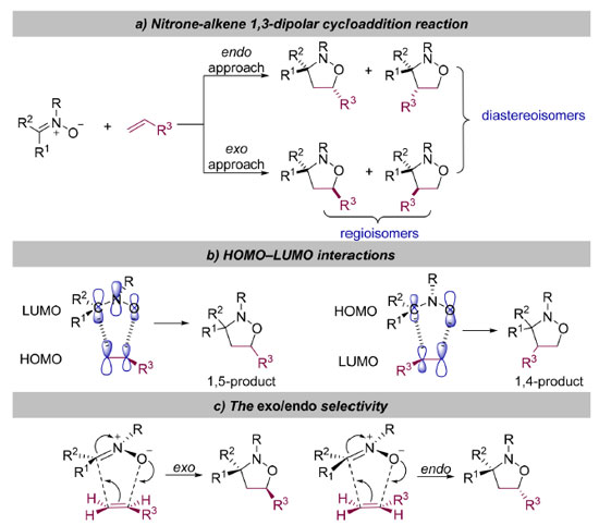 ![]() Scheme 3. a) Example of a nitrone-alkene 1,3-dipolar cycloaddition reaction, b) representation of the frontier molecular orbitals involved in the reaction and c) exo and endo transient states involved in the process