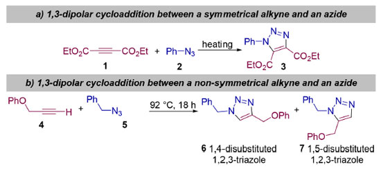 ![]() Scheme 4. Preparation of 1,2,3-triazoles from azides and a) symmetrical and b) non-symmetrical alkynes