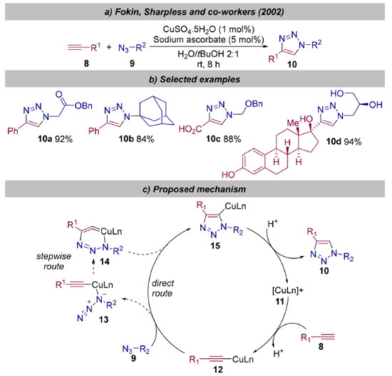Although the Huisgen 1,3-DC was a breakthrough that paved the path for the synthesis of several types of important compounds, its lack of regioselectivity was still regarded as a severe limiting issue. In order to overcome this problem, Tornøe and Sharpless independently reported in 2002 the development a variant of this process in which copper(I) is used as a catalyst to promote the reaction between terminal alkynes and organic azides.26,27 This copper-catalyzed approach affords exclusively the 1,4-disubstituted-1,2,3-triazoles as products, and its mechanism can no longer be regarded as a true concerted cycloaddition reaction, since several intermediates are observed in the process. In this sense, the reaction is known as the copper(I)-catalyzed azide-alkyne cycloaddition (CuAAC). In this case, copper(II) sulfate pentahydrate was used to produce the catalytic copper(I) species in situ using sodium ascorbate as a reducing agent (Scheme 5a). In the mechanism proposed by Fokin and Sharpless' group for the CuAAC, the Cu(I) ion initially binds to the terminal alkyne 8 forming copper acetylide 12, which then reacts with the organic azide 9 in two possible ways, either directly, giving intermediate 15, or via a stepwise route (dashed arrows in Scheme 5) in which intermediates 13 and 14 are involved (Scheme 5c). Finally, intermediate 15 undergoes a reductive elimination step, providing the 1,4-disubstituted-1,2,3-triazoles 10 as product and regenerating the Cu(I) catalyst.