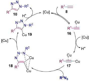 ![]() Scheme 5. Catalytic cycle for the formation of 1,4-disubstituted-1,2,3-triazoles