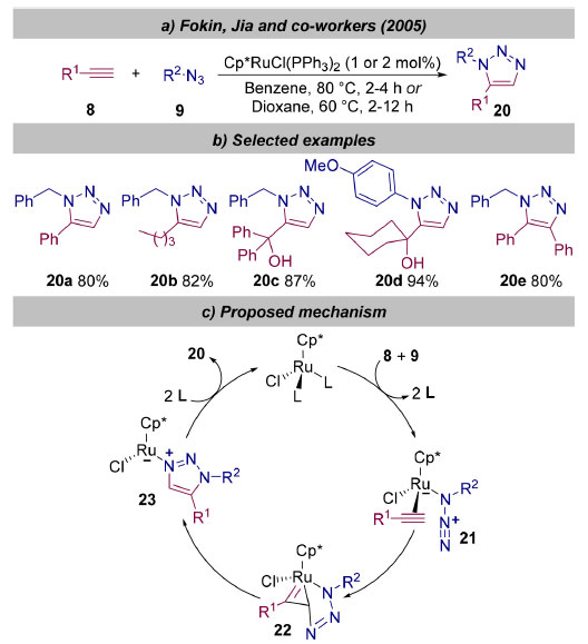The use of copper catalysts successfully enabled the selective synthesis of 1,4-disubstituted 1,2,3-triazoles, categorically solving the regioselectivity issues of 1,3-dipolar cycloaddition reactions. On the other hand, some limitations were still associated with this approach, namely the impossibility of obtaining the 1,5-isomer and the restriction to the use of terminal alkynes rather that the internal ones. Considering such drawbacks, Fokin, Jia and co-workers reported in 2005 the development of a ruthenium-catalyzed approach that allowed the selective synthesis of 1,5-disubstituted-1,2,3-triazoles (Scheme 7).29 Interestingly, the ligands present in the ruthenium complex are of crucial importance for the regioselectivity, since Ru(OAc)2(PPh3)2 led to the 1,4-isomer, while CpRuCl(PPh3)2 led to a mixture of 1,5- and 1,4-isomers in a 85:15 ratio and its methylated version, Cp*RuCl(PPh3)2, afforded exclusively the 1,5-isomer. The developed protocol was successfully applied to a wide range of azides and alkynes, with good to excellent yields of the 1,5-product being observed (Scheme 7b, 80-94%). Importantly, internal alkyne diphenylacetylene has also shown to be reactive towards benzyl azide under the same conditions, giving the corresponding 1,4,5-trisubstituted-1,2,3-triazole as product (20e, Scheme 7b). In the proposed mechanistic cycle, both the azide and alkyne partners initially displace the triphenylphosphine ligands and coordinate with the ruthenium complex, giving intermediate 21, which after an intramolecular oxidative coupling step, furnishes six-membered ruthenacycle 22 (Scheme 7c). Next, 22 undergoes reductive elimination to give Ru-functionalized triazole 23, and finally the product 20 after the restoration of the catalyst.