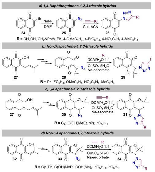 ![]() Scheme 8. Synthesis of several naphthoquinone-1,2,3-triazole hybrids with promising biological activity using CuAAC as the key step