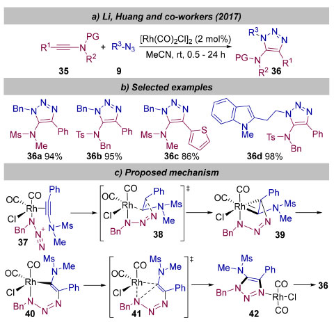 Besides copper and ruthenium, other metals have also been used as catalysts in the 1,3-dipolar cycloaddition reactions. For instance, Liao and co-workers reported in 2017 the use of rhodium as a catalyst in the 1,3-dipolar cycloaddition between internal ynamides 35 and azides 9 (Scheme 9).31 Over 30 compounds were synthesized in moderate to excellent yields (17 - 98%), with benzyl azides furnishing considerably superior yields to the phenyl-substituted ones (Scheme 9b). Importantly, the reaction was not sensitive to moisture or air, and could be performed in a variety of solvents, including aqueous medium. The group has also performed DFT calculations in order to propose a mechanism for this regioselective cycloaddition (Scheme 9c). Initially, the oxidative coupling between the azide 9 and alkyne 35 takes place via transition state 38 to give the metallobicyclic Rh-carbene intermediate 39, which is then isomerized to 40. Next, the reductive elimination via transition state 41 leads to the triazole catalyst-coordinated complex 42.