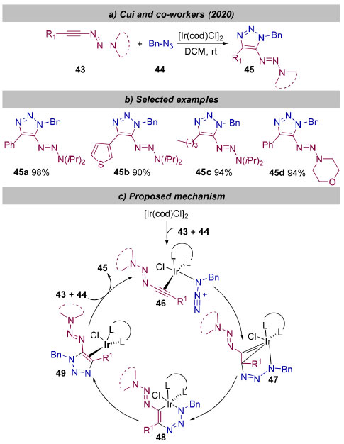 Recently, Zeng and co-workers reported the use of an iridium complex to promote the reaction between 1-alkynyltriazenes 43 and benzyl azide 44 as a direct approach towards functionalized 1,4,5-trisubstituted-1,2,3-triazoles 45 (Scheme 10).32 The use of triazene-functionalized alkynes is highly advantageous, since the triazene moiety can act as a directing group, and also may be transformed into a range of other functional groups. Using an [Ir(cod)Cl]2 complex as catalyst, several functionalized products could be synthesized in good to excellent yields (Scheme 10b, 27-98%). The proposed mechanism is similar to that of ruthenium, involving the initial coordination of both partners, giving intermediate 46, which after intramolecular oxidative addition leads to the six-membered iridacycle S 47 (Scheme 10c). Next, 47 isomerizes to 48, which furnishes 49 after a reductive elimination step. Finally, the complexation of 43 and 44 releases product 45 and regenerates the Ir(I) species 46, reestablishing the catalytic cycle.