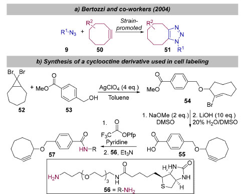 Although the thermal and metal-catalyzed 1,3-dipolar cycloaddition between azides and alkynes has proved to be a versatile method for the synthesis of 1,2,3-triazoles, finding increasing applications in polymer science, materials chemistry, and pharmaceuticals, among others, its applications in biological systems are somewhat limited. Considering these facts, Agard and co-workers described in 2004 the development of a room temperature metal-free approach for the synthesis of 1,2,3-triazoles that relies on the pronounced bond angle deformation of cyclooctines when compared to unstrained alkynes, which provides a dramatic reaction rate acceleration (Scheme 11).33 In this sense, when cyclooctine derivative 50 reacts with azides, the two regioisomers of triazole 51 are formed in approximately equal amounts. This approach was used in the functionalization of living cells with no apparent toxicity. For that, biotinylated cyclooctyne 57 was synthesized via the silver perchlorate-promoted electrocyclic ring opening of 52 to give the corresponding trans-allylic cation, which was promptly reacted with methyl 4-(hydroxymethyl)-benzoate 53 to furnish bromo-trans-cyclooctene 54 (Scheme 11b). Next, the base-mediated elimination of the vinyl bromide moiety followed by saponification leads to intermediate 55, which was coupled to biotin analogue 56 to afford 57. Then, Jurkat cells were functionalized with N-azidoacetyl sialic acid and reacted with 57 at room temperature; remarkably, the azide-functionalized cells displayed a dose-dependent increase in fluorescence upon treatment with the cyclooctyne probe 57.