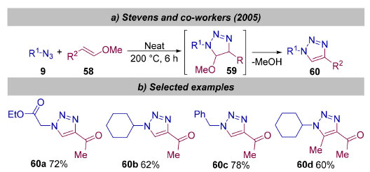 The synthesis of 1,2,3-triazoles can also be achieved using other dipolarophiles than alkynes, for instance alkenes. In this case, however, a triazoline is obtained as product, and a subsequent elimination or oxidation reaction leads to the triazole product. Stevens and co-workers, for instance, described the use of enol ethers 58 as partners in cycloaddition reactions with azides, giving intermediate 59, which affords the product 60 after an elimination step (Scheme 12). By using this approach, several 1,4-disubstituted-1,2,3-triazoles 60 could be synthesized with moderate to good yields (49-78%) under solvent-free conditions (Scheme 12b).34