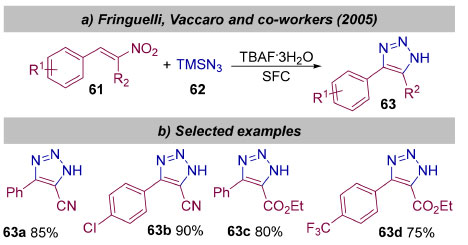 Another important work in this field was disclosed by Amantini and co-workers in 2005, which employed electron-deficient olefins 61 as dipolarophiles and trimethylsilyl azide 62 in the presence of TBAF, obtaining 4-aryl-5-cyano- or 4-aryl-5-carbethoxy-1H-1,2,3-triazoles 63 as products (Scheme 13).35 In this case, a triazoline-type intermediate is also initially formed and converted to the desired products upon elimination of HNO2; several products were prepared with yields ranging from 70 to 90% (Scheme 13b).
