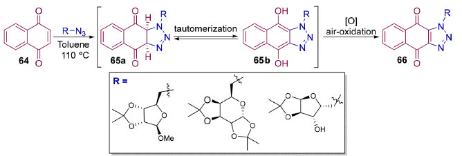 1,4-Naphthoquinones may also be used as electron-deficient alkenes in the synthesis of 1,2,3-triazoles. Campos and co-workers reported the use of such scaffolds in the presence of glycosyl azides aiming the synthesis of fused naphthotriazole derivatives via a thermal [3+2] cycloaddition reaction (Scheme 14).36 Natural glycosyl-conjugated compounds are useful drugs commonly used clinically in the treatment of cancer, the carbohydrate residues in these structures being important for their solubilization, as well as for decreasing their toxicity and improving their pharmacokinetic properties.37,38 A possible mechanism for this transformation involves an initial 1,3-DC reaction between 64 and the glycosyl azides, producing the corresponding triazoline intermediates 65a, which are tautomerized to 65b and further oxidized to form the glycotriazole derivatives 66.