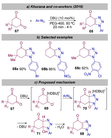 ![]() Scheme 15. DBU-catalyzed synthesis of fused 1,2,3-triazoles 51 from cyclic 1,3-dicarbonyl compounds and organic azides