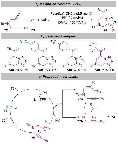 In some cases, organic and inorganic bases may be used to activate the dipolarophile and promote the reaction. An interesting example of such approach is the work published by Singh and co-workers, who developed the DBU-catalyzed synthesis of fused 1,2,3-triazoles 68 from the cycloaddition of various aryl azides with cyclic 1,3-dicarbonyl compounds 67 in PEG-400 (Scheme 15).39 This metal-free procedure enabled the synthesis of a series of fused 1,2,3-triazoles (78-92%) using readily available starting materials in a short reaction time (Scheme 15b). Additionally, the possibility of recycling both the catalyst and the solvent are major advantages of this approach. In the proposed mechanism, DBU initially deprotonates the 1,3-dicarbonyl compound 67, giving ion pair intermediate 69, which undergoes a cycloaddition step with the azide partner, furnishing 70 (Scheme 15c). Next, 70 is protonated by the HDBU+ species, giving triazoline 71. Finally, the elimination of a water molecule from 71 gives rise to product 68. Another interesting method for the synthesis of fused triazoles was reported in 2019 by Duan and co-workers, who described a novel palladium-catalyzed three-component approach using allenynes 72, aryl or alkenyl iodides 73, and sodium azide for the synthesis of bicyclic 1,2,3-triazoles 74 (Scheme 16). Over 20 examples were reported using this protocol, with moderate to good yields (Scheme 16b, 38-79%). On the other hand, when an allenyne bearing a carbon atom attached to two ester groups in place of N-Ts was used, the corresponding desired product was not formed. Based on a series of control experiments, the authors proposed a mechanism in which the oxidative addition of the aryl iodide 73 to the Pd(0) catalyst initially takes place, giving intermediate 75 (Scheme 16c). Next, 75 undergoes insertion with the allene compound 72, leading to (π-allyl)palladium intermediate 76, which is then attacked by the azide anion, giving interconvertible 77a and 77b (via a Winstein allylic azide rearrangement) as intermediates. Finally, an intramolecular cycloaddition furnishes fused 1,2,3-triazoles 74.40