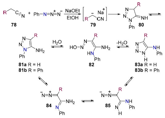A substantially more complex 1,3-DC is the reaction of ethyl cyanide with aryl azides, in which a cyclization involving the nitrile group takes place. This reaction is an important approach towards the preparation of 5-amino-1,2,3-triazoles and was studied by Otto Dimroth.41,42 Dimroth observed a rearrangement of the nitrogen atoms in the structure that led to the conversion of 1,2,3-triazoles into other isomeric 1,2,3-triazoles with different atom connections. As shown in Scheme 17, the initial deprotonation of nitrile 78 gives active anionic dipolarophile 79, which undergoes a cycloaddition reaction with phenylazide to furnish imine triazole 80, and 81 is then formed upon tautomeric equilibrium. The ratio of different 1,2,3-triazole compounds in the equilibrium is temperature-dependent, and their interconversion is proposed to occur via open intermediate 82 upon reaction with water. The mechanism of DR may be explained via the closure of diazoimine intermediates (84 and 85) to furnish the triazole compounds (81 or 83, Scheme 17).43- It is important to highlight that in the last decades the Dimroth rearrangement has become an important reaction in organic synthesis, allowing the preparation of new substances that are not easily rationalized via retrosynthetic analyses.46,47
