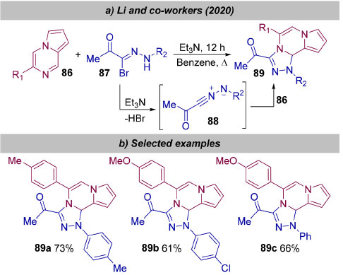 Another important type of dipoles are nitrilimines, which can be generated in situ via the base-promoted dehydrohalogenation of the corresponding hydrazonoyl halides. The 1,3-dipolar cycloaddition reaction of such compounds with alkynes, alkenes, and C=N bond-containing compounds provide a simple method for the construction of substituted pyrazoles, pyrazolines and 1,2,4-triazoles. Recently in 2020, Huang and co-workers developed a methodology involving regioselective 1,3-DC of nitrilimines 88 generated in situ from the reaction between (Z)-N-aryl-2-oxopropanehydrazonoyl bromide 87 and Et3N with 3-arylpyrrolo[1,2-a]pyrazines 86, affording 1-(1,5-diaryl-1,10b-dihydropyrrolo[1,2-a][1,2,4]triazolo[3,4-c]pyrazin-3-yl)ethanones 89 (Scheme 18).48 Several 3-arylpyrrolo[1,2-a]pyrazines 89 were successfully employed in this protocol, giving products 89 in moderate yields (61-79%, Scheme 18b).