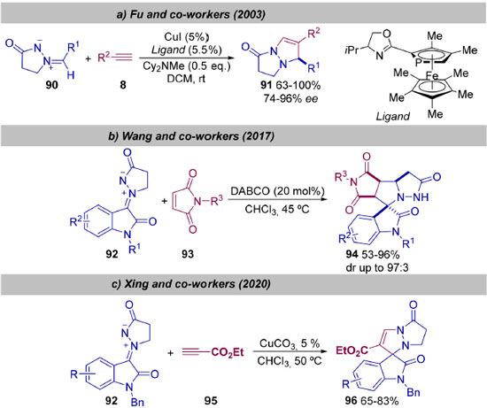 Synthesis of Pyrazole/Tetrazole Derivatives Undoubtedly, azides are the mostly used dipole partner in 1,3-dipolar cycloaddition reactions. However, several other dipoles have also been explored in this reaction, leading to high structural diversity. Azomethine imines, for instance, are 1,3-dipoles of the allylic type and present two type of resonance structures, iminium imide and diazonium ylide. Such compounds are readily accessible and stable, and have been observed as intermediates in the synthesis of different di-nitrogenated heterocycles through 1,3-DC under thermal or catalyzed conditions.49 The 1,3-DC reaction of azomethine imines with alkynes has been widely employed in the last decades as an efficient strategy for the preparation of important N-heterocyclic compounds. Fu and co-workers, for example, published back in 2003 one of the seminal works in this field, which described the enantioselective reaction between azomethine imines 90 and terminal alkynes 8, leading to the N,N'-bicyclic pyrazolidinone products 91 (Scheme 19a).50 In recent years, several important works have been reported involving this type of dipole, e.g. the 1,3-DC between isatin N,N'-cyclic azomethine imine 92 and maleimides 93, which gave the interesting spirooxindole scaffolds 94 as products rather than the expected corresponding pyrazolidinones, as described by Wang and co-workers in 2017 (Scheme 19b).51 Recently in 2020, the reactivity of isatin N,N'-cyclic azomethine imines 92 was once again probed, this time towards electron deficient alkynes 95, furnishing spiro pyrazolidinones 96 (Scheme 19c).52
