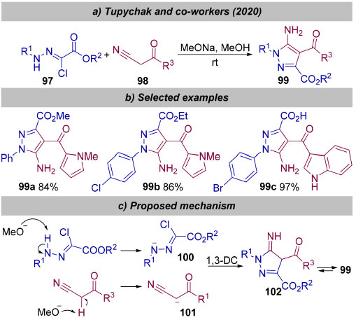 In 2020, Tupychak and co-workers reported the synthesis of 5-aminopyrazoles 99 with high yields and regioselectivity employing the base-promoted 1,3-DC between hydrazonoyl chlorides 97 and propanenitriles 98 (Scheme 20).53 In the proposed mechanism, the base initially abstracts the acidic hydrogen from both the hydrazonoyl chloride 97 and the propanenitriles 98, giving 100 and 3-oxopropanenitrile enolate 101, respectively. In the next step, the enolate 101 attacks the electrophilic carbon of hydrazonoyl chloride, leading to the imine derivative 102, which is tautomerized to pyrazole 99 (Scheme 20c).
